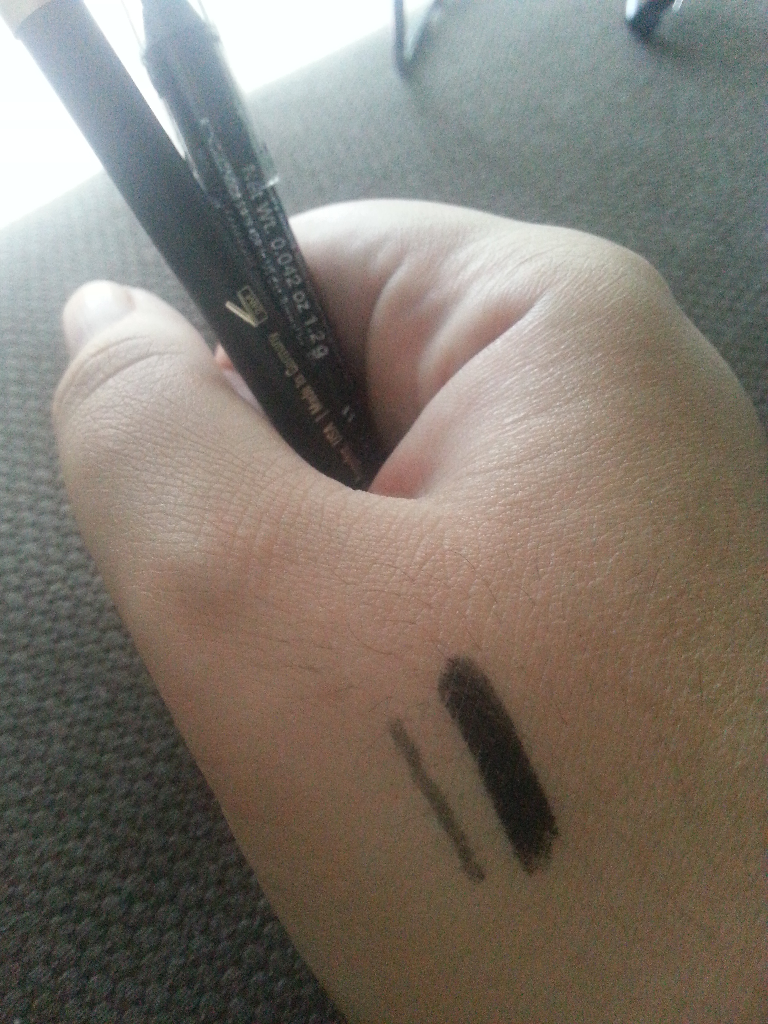 ‘Well, Amne. You might have eye-liner-hating eyes.’ OKAY, FINE. LET’S HAVE A LOOK AT MY HAND TEST. On the left, Napoleon Perdis Eye Liner. On the right, Rimmel London Scandaleyes liner.